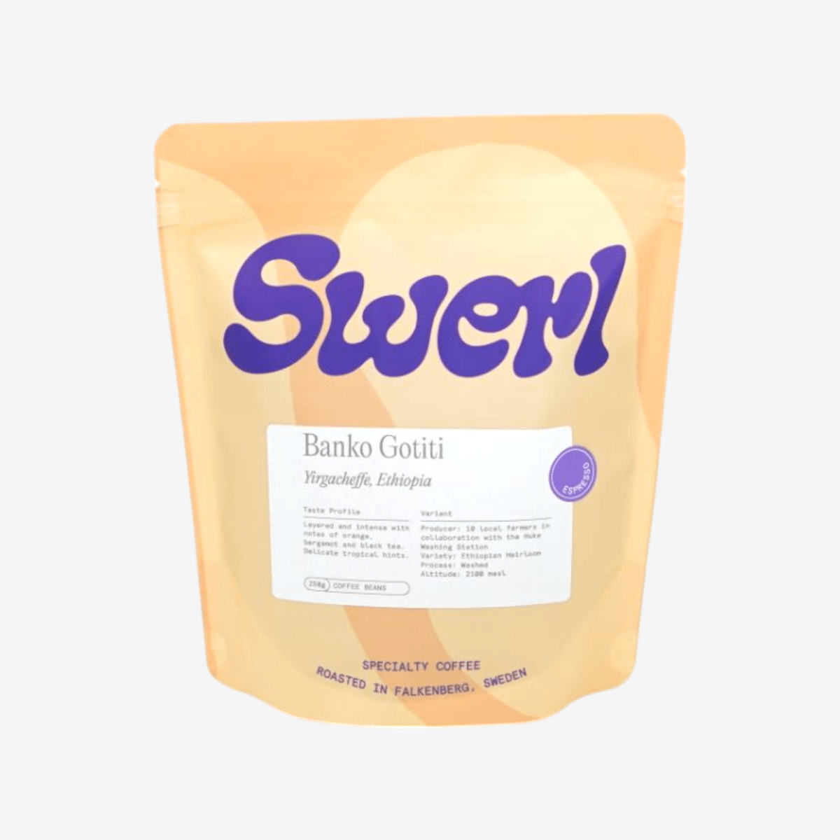 Banko Gotiti är ett espressokaffe med ursprung i den högt belägna regionen Yirgacheffe, Etiopien, där 10 småskaliga producenter samarbetar med Huke Washing Station för att skapa ett kaffe med exceptionell komplexitet och sötma.