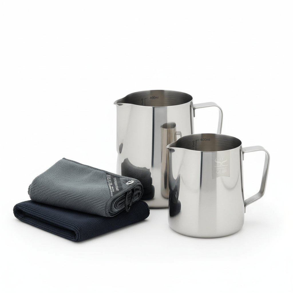 Barista algkomplekt - 2 piimakannu ja 3 baristarätikut