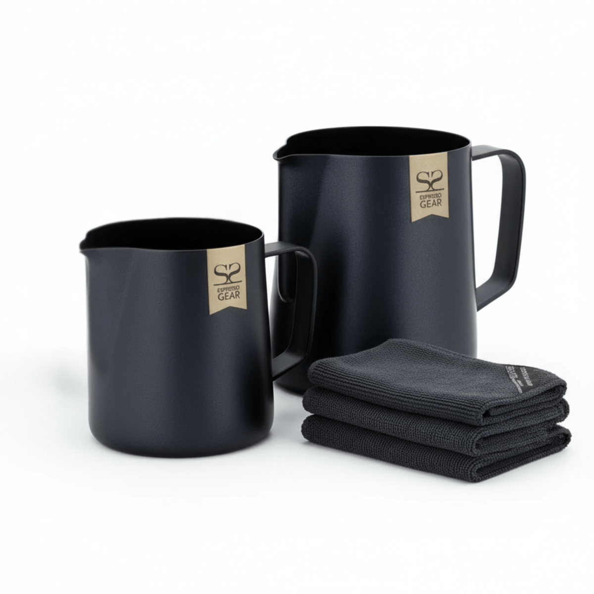 Elegantne mattmust pind ei anna mitte ainult premium-tunnet - see on ka praktiline. Tekstuuriga viimistlus tagab parema haarde piimavahu tegemisel ning peen välimus sobib ideaalselt kaasaegsete espressomasinatega. Espresso Gear kuldne logo lisab eksklusiivse puudutuse.